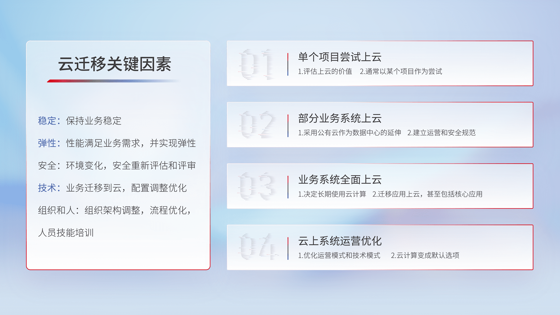结合实际业务,,,从规划设计、、、云平台选型、、、、云原生改造、、数据迁移、、集成交付,,,迁移全过程为客户识别最佳上云路径,,,做好风险识别管理,,,,设计网络架构、、、、身份权限、、、安全审计合规、、、操作审计、、日志审计、、、监控告警策略、、、多站点容灾设计等,,对云上基础设施进行整体规划,,,,提升IT治理水平,,,以满足弹性、、、高可用、、、、高性能的需求。。。