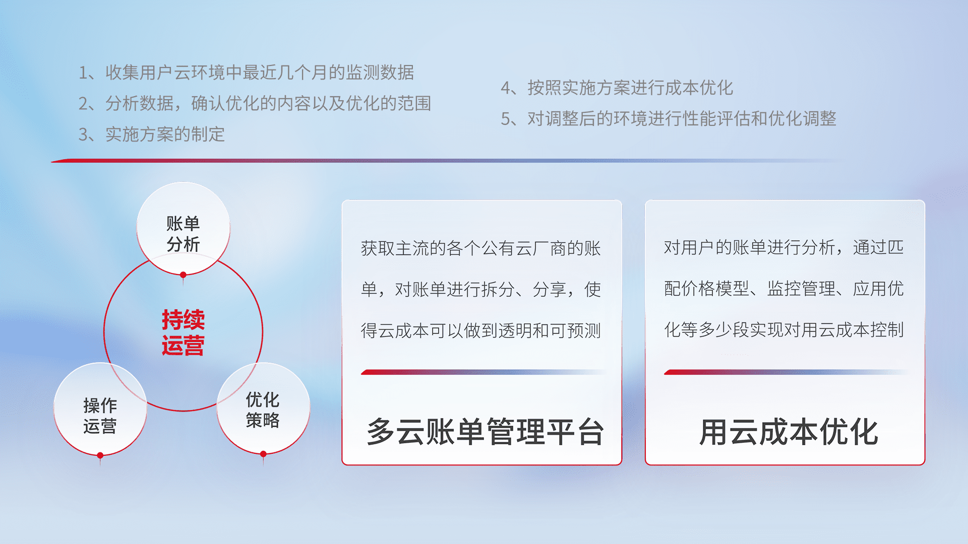 通过多云纳管,,,,以统一的资源数据模型把客户的云资源进行抽象和封装,,,进而实现对多云资源的统一操作,,,保障云资源管理的可靠性、、、、稳定性与可用性。。。。量身定制化运维内容,,,,配置、、、开发运维、、、补丁管理、、备份、、、、监控、、、认证和访问管理、、审计和日常巡检等,,,,保障在用云过程中的可靠度,,稳定度以及高可用率。。。